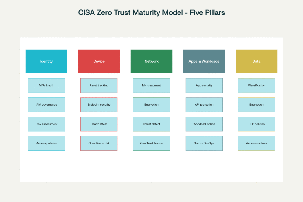 The CISA Zero Trust Maturity Model organizes implementation around five interconnected pillars: