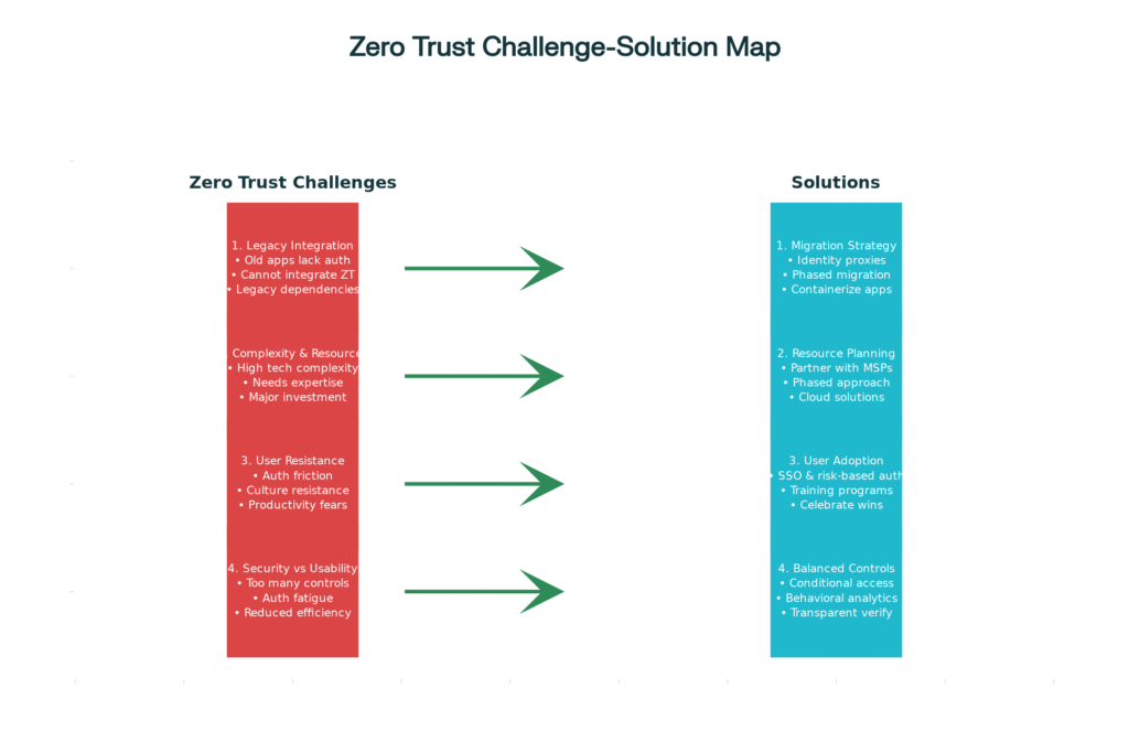 Cultural Resistance and User Experience: Employees may resist continuous verification and additional authentication steps. Invest in comprehensive change management and security awareness training. Design user experiences minimizing friction through SSO, risk-based authentication, and context-aware policies.